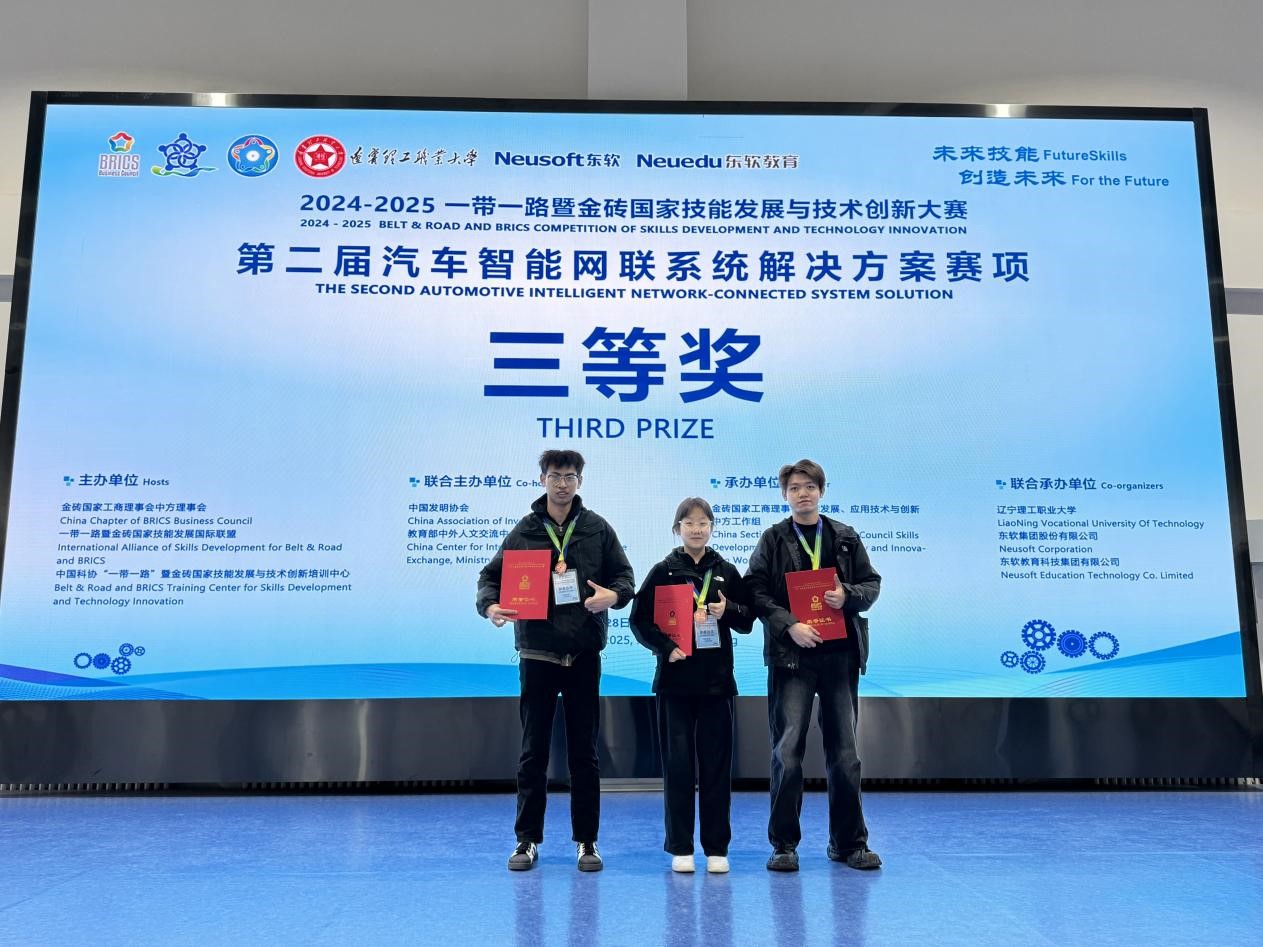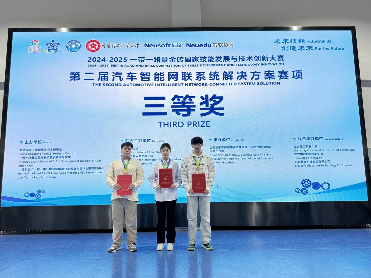 2025年3月28日-29日,2024一带一路暨金砖国家技能发展与技术创新大赛之汽车智能网联系统解决方案赛项国内赛决赛在辽宁理工职业大学隆重举行,来自全国的55支参赛队伍同台竞技,金年会信息工程学院邱志旺、宋志鹏、杨雪以及陈明泽、曹耘赫、丁莹六名学生组成的两个团队,凭借着娴熟的专业技能、良好的心理素质,分别获得三等奖,为学校争得了荣誉。