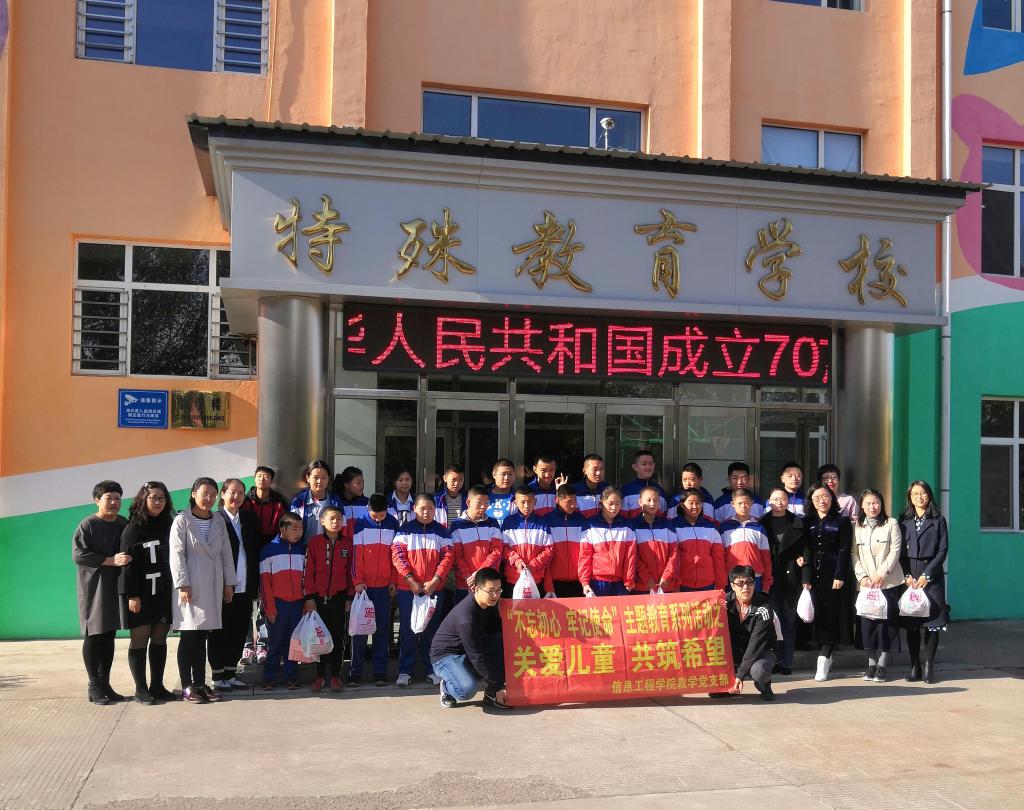 按照学校党委关于开展“不忘初心、牢记使命”主题教育工作的部署及方案要求,10月10日,信息工程学院党总支组织教师党员来到了双城区特殊教育学校,开展以“不忘初心、牢记使命”为主题的关爱儿童共筑希望志愿服务活动。13点30分来到双城区特殊教育学校,文霞校长、尹立新副校长对此次的志愿服务活动表示热烈欢迎,随后带领我们参观全校同时讲解了学校概况。