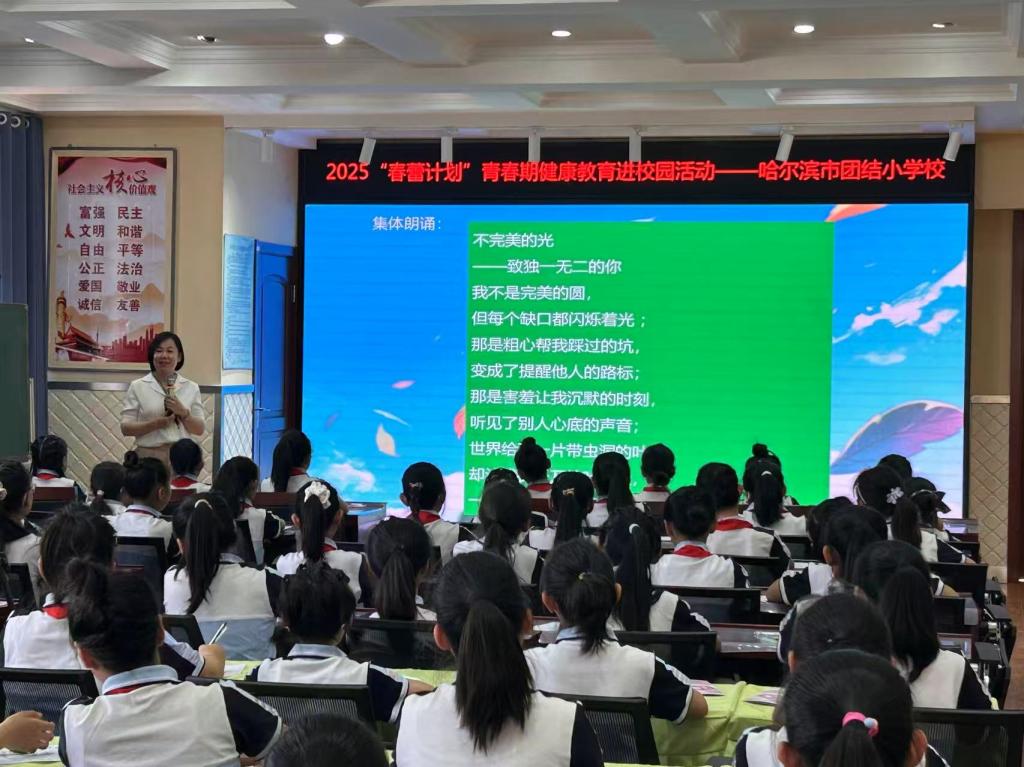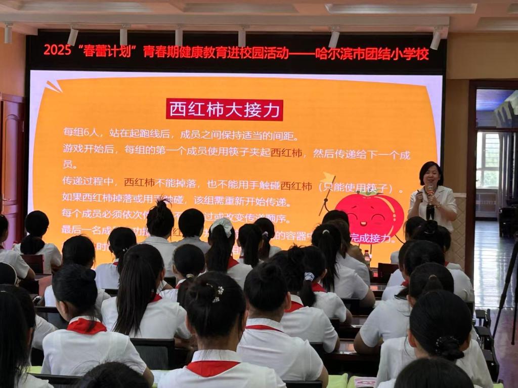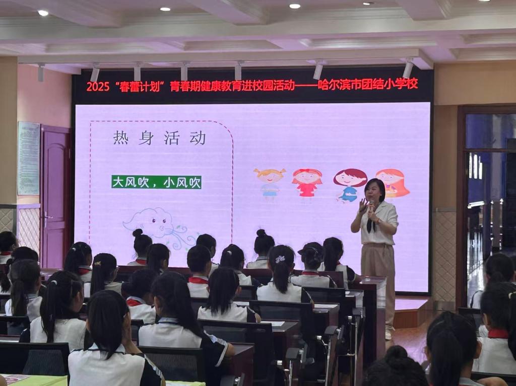 2025年5月30日上午,在黑龙江省妇女儿童基金会的邀请下,金年会心理健康教育咨询中心副主任蔡培培走进哈尔滨市团结中心小学校,为100多名女同学上了一堂生动的心理课,拉开了2025年“春蕾计划”青春期健康教育进校园活动的序幕。