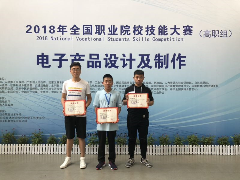 5月22——24日,在 2018年全国职业院校学生技能大赛国赛(高职组)“电子产品设计及制作”赛项中,金年会电气工程学院电气自动化技术专业学生王麒懿、应用电子技术专业学生陈占坤、孙岩在指导老师黄雨鑫和徐鹏指导下,沉着应对,稳定发挥,从69支参赛队中突出重围,最终获得国赛三等奖的好成绩,完成本赛项历史性突破。