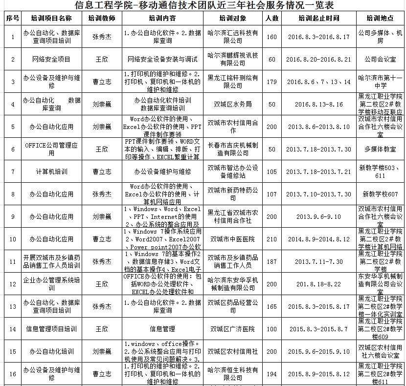 移动通信技术团队全体教师的社会服务能力强,尤其曹立志、王欣老师分别到移动通信公司、深圳软件园进行技术服务,其他老师也均利用寒暑假为社会提供技术服务、为移动通信技术和移动互联网技术发展提供咨询服务以及应社会需求提供高技能人才培训服务等。
